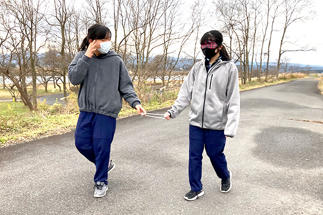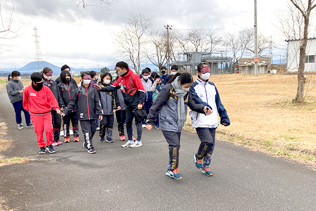 まず、目が見えない状態での「走行・ジョギング体験」を実施。二人一組になり、一人はアイマスクを付け視覚障がい者役として歩き、もう一人は介助者役として相方を助けます。光がない中で歩く・走る等の動作は怖い!と生徒たちは声を上げていました。