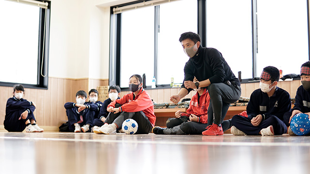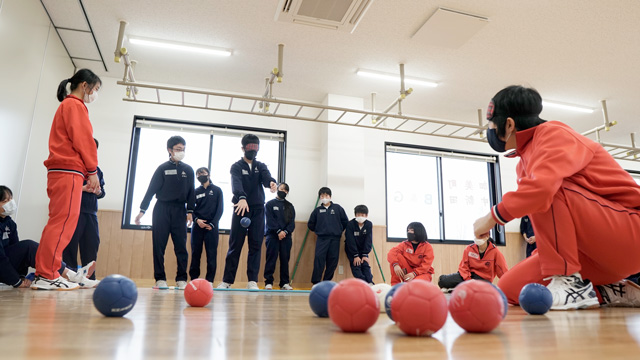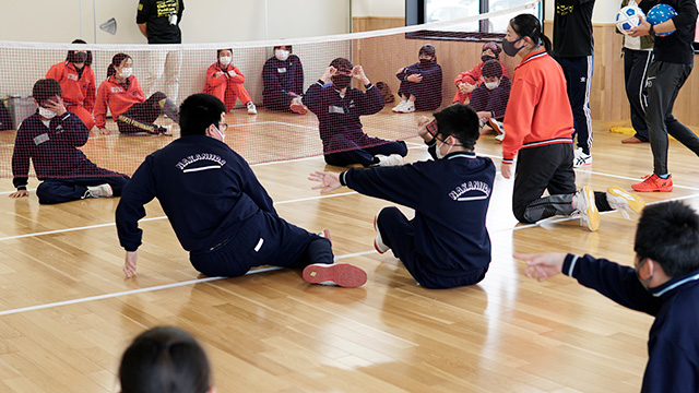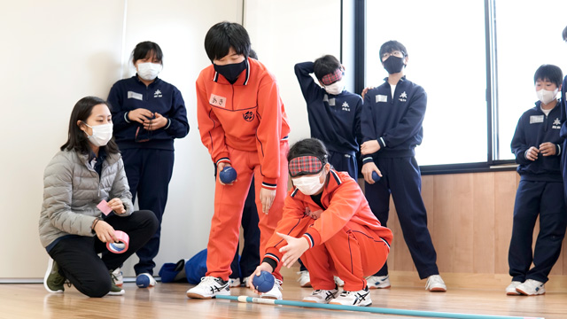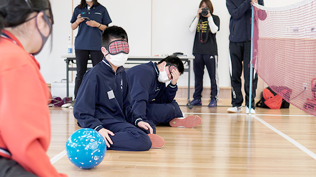 生徒たちは前回行った内容を振り返りながら、シッティングバレーのラリーの練習から開始。その後、今回のテーマである「視覚障害」に関する体験を実施しました。