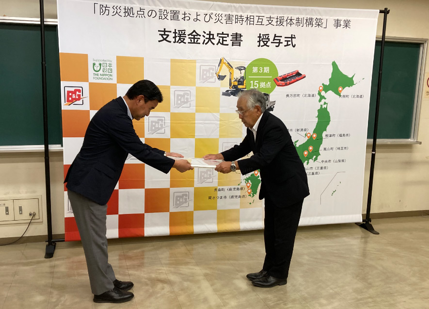 B&G財団は、2021年度から自治体と連携し、災害支援に即応できる機材と人材を備えた「防災拠点」を整備し、油圧ショベルとダンプカー、救助艇などの機材を配備するとともに、機材の操作方法と災害対応の研修を受けた人材を育成。