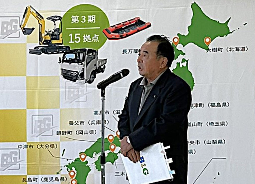 B&G財団は、2021年度から自治体と連携し、災害支援に即応できる機材と人材を備えた「防災拠点」を整備し、油圧ショベルとダンプカー、救助艇などの機材を配備するとともに、機材の操作方法と災害対応の研修を受けた人材を育成。