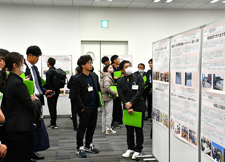 災害時要配慮者を対象とした拠点研修の実施について、各自治体が作成したポスターに基づき情報交換を行った。各拠点が実施した外国人や障がい者、子ども、女性を対象とした訓練や教室の事例が報告された。