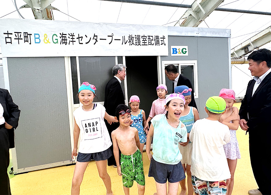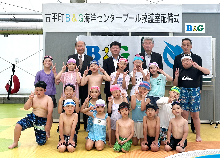 古平町B&G海洋センター(北海道)で、熱中症対策事業「救護室配備式」が6月24日に行われ、古平町 成田昭彦町長、奥山均副町長、三浦史洋教育長、B&G財団常務理事岩井正人をはじめ、地元の小学生、関係者など約25人が出席した。