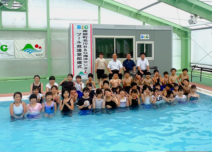 工藤町長は、「新型コロナの5類移行により昨年来、役場の隣にある海洋センターから子どもたちの元気な声が毎日聞こえてくる。しかし、近年の猛暑の影響で室温45度を超えるプールでの熱中症の危険性を心配していた。今回、救護室を設置できたことで急病人の対応だけでなく、保護者や見学者の休憩室としても活用でき、皆が安心して楽しくプールを利用できる」と述べた。