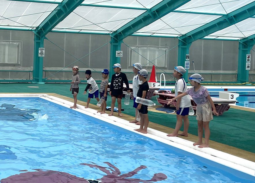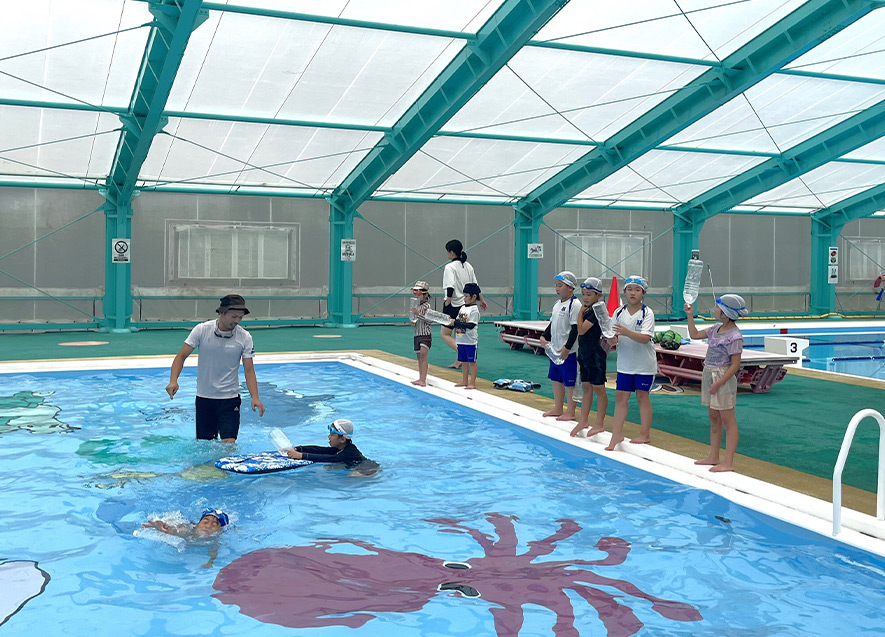 式典後は小学校低学年対象の着衣泳教室が行われ、子どもたちは落水時の対処法を学んだ。熱中症対策や応急手当が可能になったプールでさらに安心安全な利用を促進する。