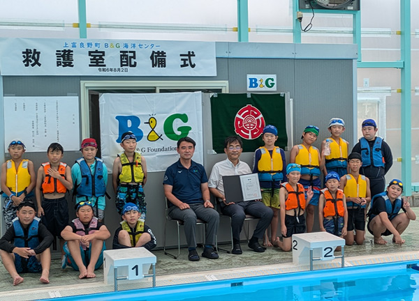 上富良野町B&G海洋センター(北海道)で、熱中症対策事業「救護室配備式」が8月2日に行われ、上富良野町 斉藤繁町長、B&G財団常務理事朝日田智昭をはじめ、地元小学生、関係者など約30人が出席した。