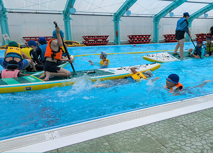 式典後はSUP体験が行われ、子どもたちは沈(落水)しながらも笑顔で果敢にチャレンジしていた。熱中症対策や応急手当が可能になったプールでさらに安心安全な利用を促進する。