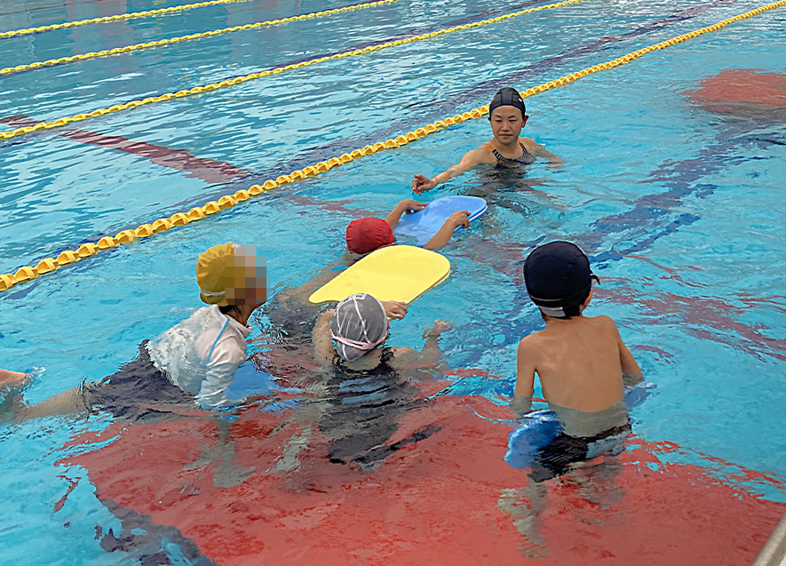 式典後に行われた水慣れ教室には、小学校低学年15人が参加。腰かけキックやビート板キックなど、水泳の基本動作を練習した。熱中症対策や応急手当が可能になったプールでさらに安心安全な利用を促進する。