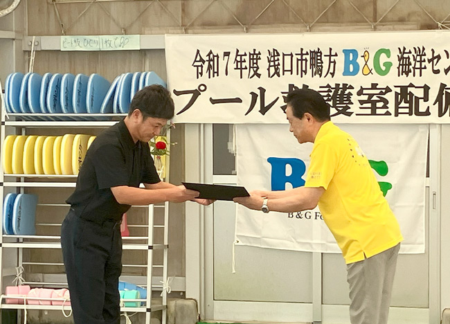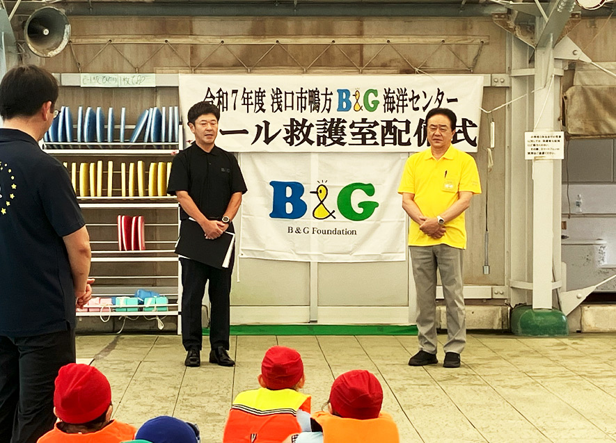 栗山市長は、近年、世界各地で猛暑が深刻な問題となっている。浅口市では寄島の海洋センターにも救護室を配備しており、これからもB&G財団とともに、子どもたちの健全育成のため様々な事業に取り組んでいきたいと話した。