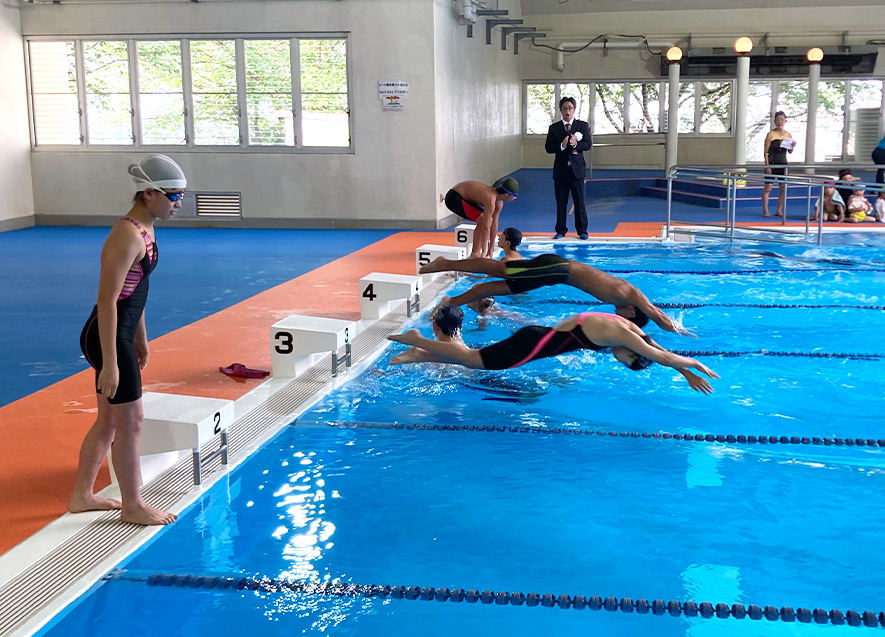 ・主催者挨拶 林市長 ・来賓挨拶 菅原理事長 ・テープカット ・オープニングセレモニー(幼児から高齢者による泳ぎ初め) |