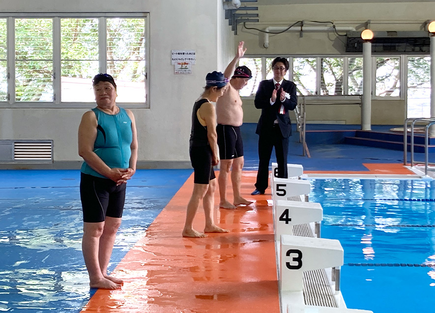 林市長は「当施設は1996年に無償譲渡を受けて以来、今日まで市民の健康づくりの場として多くの皆様に利用いただいている。今回の修繕助成を活用し、プール缶体やボイラー・空調設備など更新を行った。特にプール缶体は見違えるように綺麗になり、市民一同大変喜んでいる。今後も皆様に喜ばれる良い施設になるよう努めていく」と述べた。