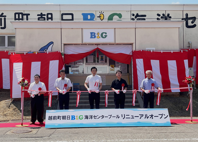 「海洋センター修繕助成制度」事業を活用し施設の改修を終えた越前町朝日B&G海洋センタープールにて、リニューアル式典及び記念イベントが行われた。