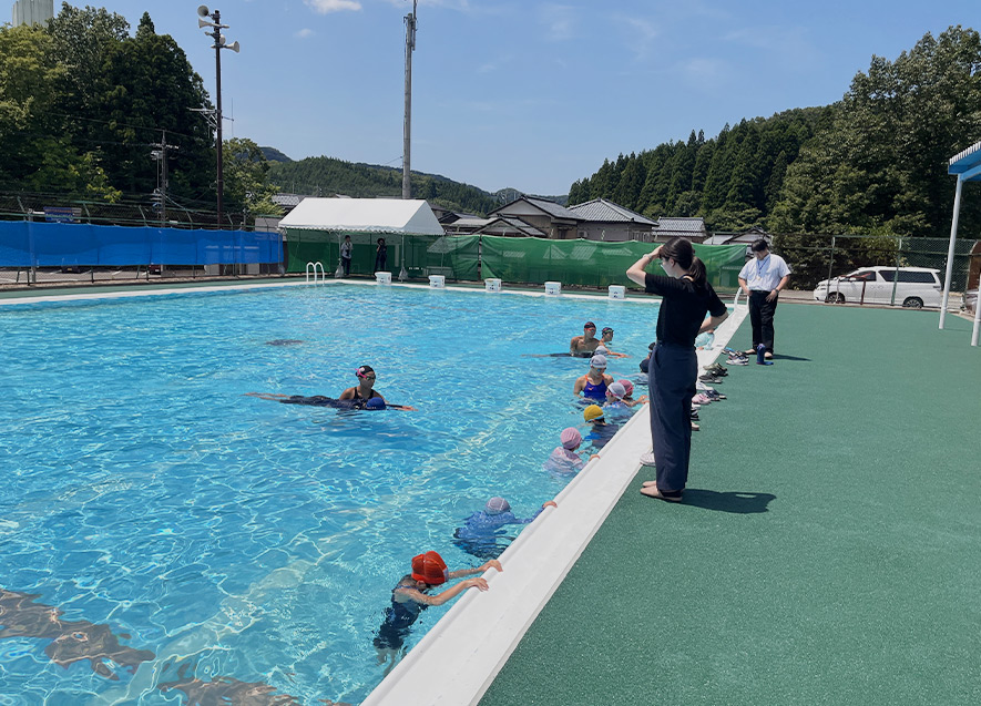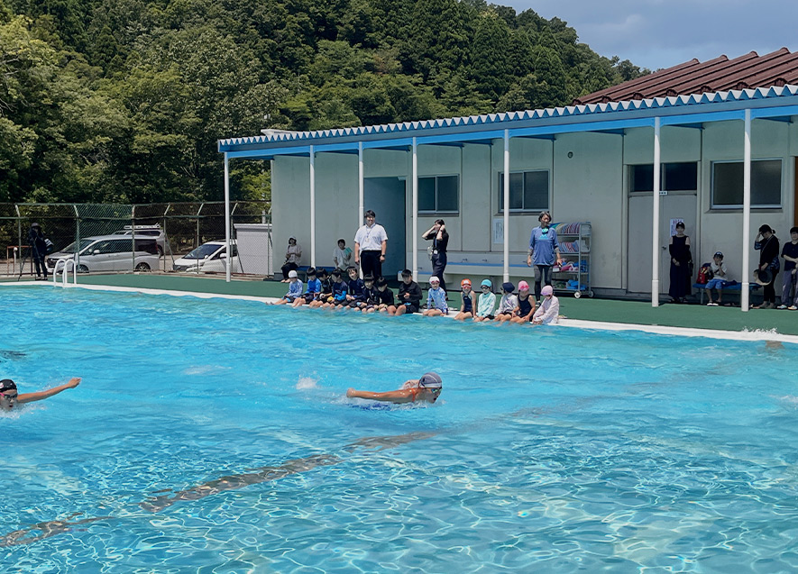 式典後は、町内小学生15人を対象に水泳教室が行われ、講師を務めたのは、福井高校および啓新高校の水泳部員。開始前には高校生による「泳ぎ初め」も披露され、児童たちは憧れのまなざしで見つめていた。