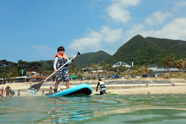海洋センターの前面では、SUPにいそしむ子供たちの姿が