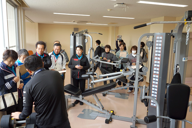 リニューアル後の施設見学会。トレーニングマシンの説明に聞き入る参加者ら