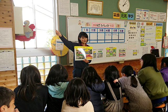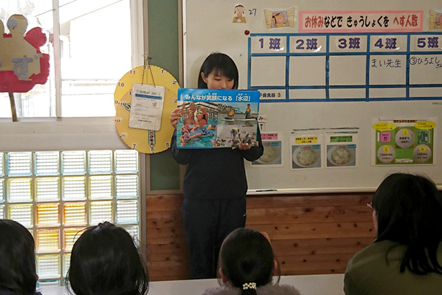 ただ、地域での海洋センターの認知度が低いことが意識調査でわかりました。そこで、海洋センターから離れた、放課後子ども教室に出向き、水辺の安全教室紙芝居を実演。海洋センターのPRを行いました。