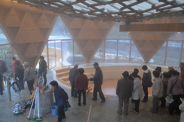 そこで、地域の高齢者の方々を対象に、温泉と運動についての学習会を実施。温泉施設での「湯中運動」、B&G体育館での「マシーントレーニング」を組み合わせたプログラムの見学会を行いました。