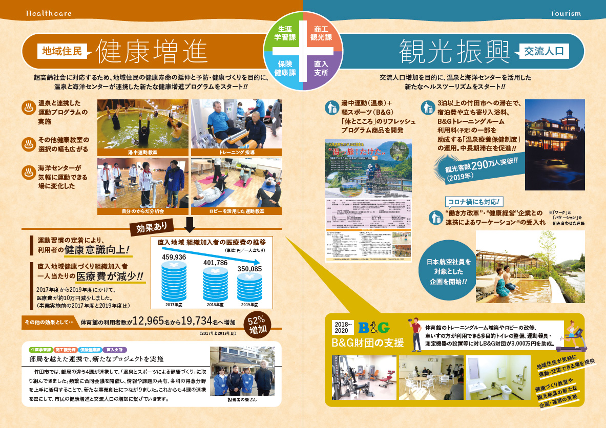 竹田市は地域資源である「温泉」と海洋センターでの「運動」を一体的に利用することで、市民の健康寿命の延伸とヘルスツーリズムによる観光振興を図ることを目的に、2018年度から大分県竹田市とB&G財団が連携し、温浴と運動を融合した健康増進プログラムに取り組んできました。