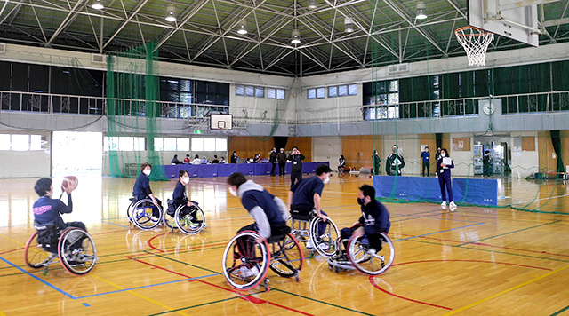 車いすバスケットボールでは、香川県車いすバスケットボールクラブの選手達による3対3の模擬試合も行われていました。選手の巧みなチェアワークやスピード感ある迫力満点のプレーに、参加者はみな驚きの表情を見せていました。