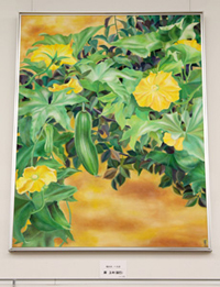 山梨で栽培されている農作物をモチーフに、明るい色彩と伸びやかな筆致で表現されています。