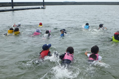 「水辺の安全教室」では、ペットボトルを使った救助法やライフジャケット浮遊体験なども行いました