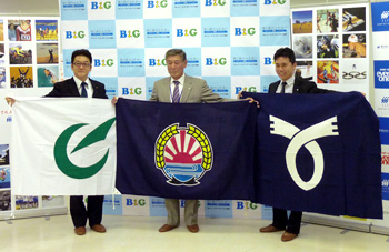 前日のレセプションでは、3町長それぞれに町旗を持って大会への抱負を語りました