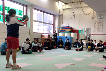 午後からは、同研究所の葉山 亜希恵 氏によるプールでの実技研修を行い、水中でのバランス感覚を養うプログラムを体験しました。その後、幼児フロア運動教室の実技研修として、深川VIP体操クラブで運動プログラムを指導している藤井 初美 氏からレクチャーを受け、運動動作の解説や指導時の注意点、柔軟体操の重要性などを学びました。