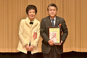 「特A評価」の表彰を受けた府中市の戸成義則市長(左)と愛南町の清水雅文町長(右)