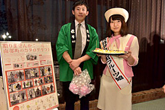 会場には「自治体紹介ブース」に詰めていた青森県南部町の「フルーツ娘」も登場。自慢のリンゴを配ってくれました