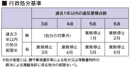 乗船者にライフジャケットを着用させなかった船長(小型船舶操縦者)には、違反点数2点が付され、再教育講習を受講しなければなりません。違反点数が累積して行政処分基準に達すると、最大で6か月の免許停止になります。