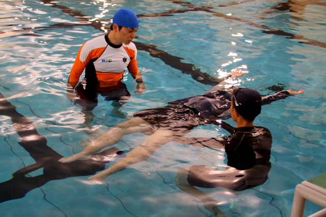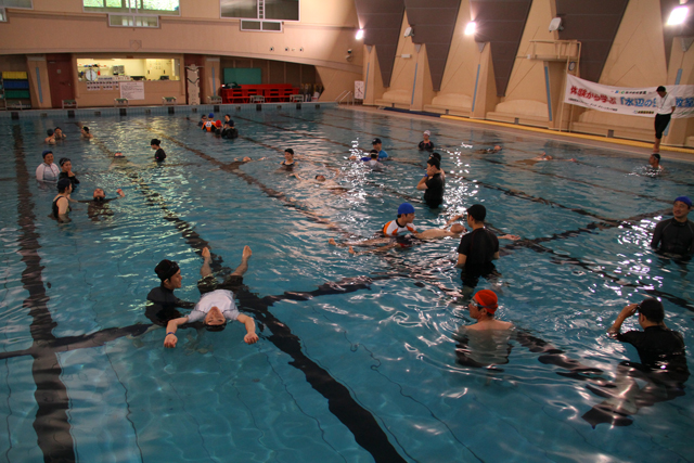 研修は、水難事故の現状や事例、引率時の注意事項などの講義の後、会場を温水プールに移し、背浮きやペットボトル浮き、救助実技などの実技講習を行いました。研修に参加した女性の小学校教員は「今回のような研修は初めて参加しました。背浮きやその補助方法などを実体験できましたので、よくわかりました。」との感想をいただきました。また、昨年度、小学校授業で「B&G水辺の安全教室」を実施している男性の小学校教員は「実際に背浮きをやってみると、意外と難しかったです。ペットボトル浮きなどは工夫すると浮きやすくなることも分かりましたので、今年はもう少し上手に子供たちに伝えることができると思います。」と、これから行う安全教室についても語っていただきました。