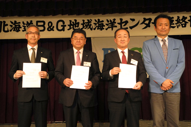 北海道ブロックでは、沼田町、岩見沢市、浦臼町の海洋センターに、海を守る植樹教育事業実施支援決定書が授与されました(4月27日)