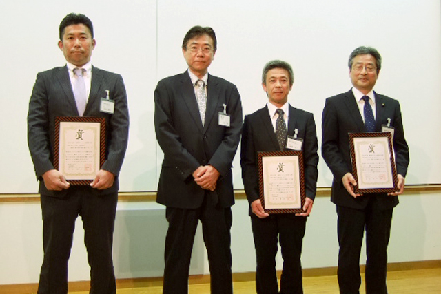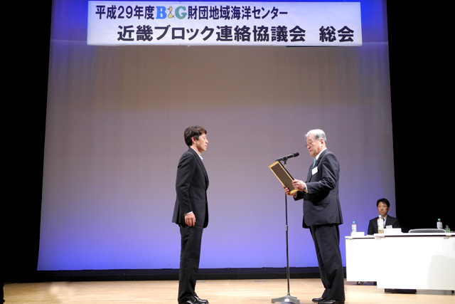 梶田功会長(右)からクリーンフェスティバル10年連続実施センター表彰を受ける兵庫県猪名川町B&G海洋センター(近畿ブロック総会、5月11日)