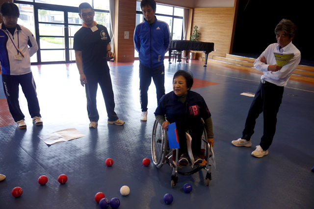 近畿ブロックの指導員研修会(5月11日、滋賀県日野町立日野公民館)には31人が参加。健常者も楽しめる障害者スポーツである「ボッチャ」を学びました。重度の脳性まひや四肢に障害がある人のためにヨーロッパで考案されたスポーツ。ジャックボールと呼ばれる白い球に赤、青それぞれ6球ずつのボールをどれだけ近づけられるかを競います。