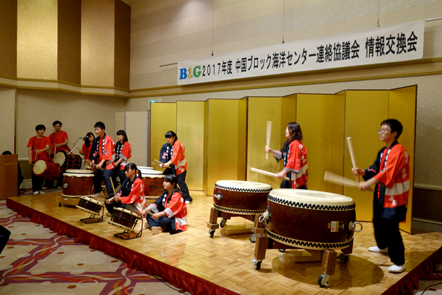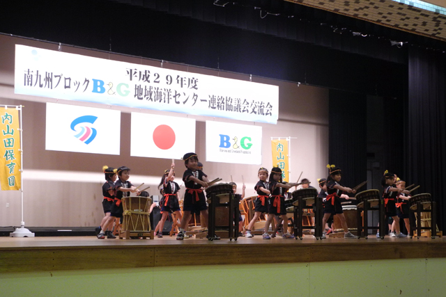 地元の出し物が披露され、中国ブロック・岡山県奈義町の「歌舞鼓音座」と南九州ブロックでは南さつま市内山田保育園児が太鼓を演奏しました。歓迎する南さつま市の本坊輝雄市長は「縁あってここに集っています。B&Gの活動を通して、地域の子どもたちのために力を合わせて頑張っていきましょう」とあいさつしました。