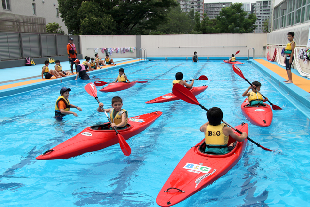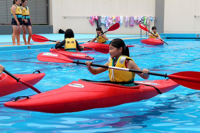 今年は、6月28日に実施した台東区の松葉小学校をスタートに、昨年の22校を大きく上回る都内31校の学校授業等で実施。6月29日の江東区第二辰巳小学校の6年生104人が参加し、背浮きやペットボトル浮き、ライフジャケット体験をはじめ、カヌー体験も行いました。