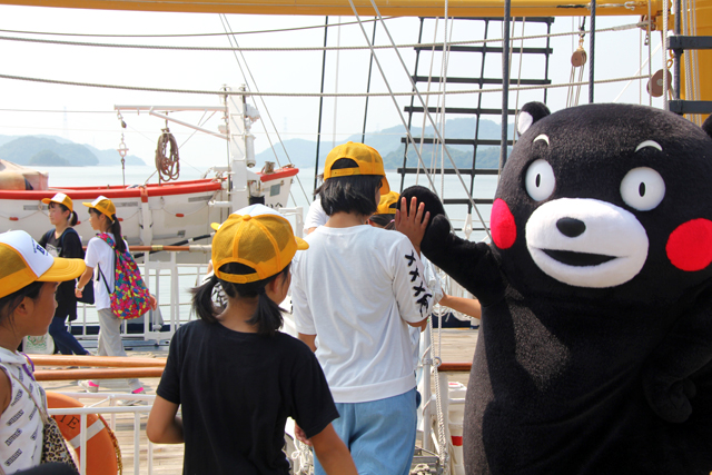 宿泊を伴う行程には、熊本市と南阿蘇村の2自治体の子供たち計64名が参加しました。 7月31日(月)は、熊本市の子供たち32名を招待し、熊本県のご当地キャラクター「くまモン」に見送られながら宇城市の三角港を出航しました。船内では、セイル張りやバウスプリット(船首から延びる細い棒)渡り等のプログラムを体験した後、鹿児島県長島町沖にて船内泊。翌朝、長島町の小浜海水浴場でカヌーやニッパーボードなどのマリンスポーツを体験した後、バスで熊本市まで帰りました。