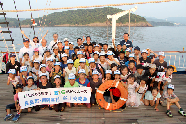 同日午後からは、南阿蘇村の子供ら32名がバスで長島町の小浜海水浴場に到着。熊本市の子供たちと入れ替わり、マリンスポーツを楽しんだ後、鹿児島県長島町の沖に停泊している帆船みらいへに乗船。船上で長島町の子供たちと交流し、同町の特産品である「ブリ」などを味わいながら懇親を深めました。