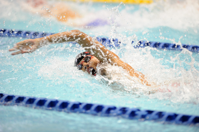 今大会は、東京辰巳国際水泳場に会場を移してから10回目の記念大会であり、大会ゲストとしてリオデジャネイロオリンピック200m×4人フリーリレー銅メダリストの江原騎士選手を招待しました。昼の休憩中に江原選手が模範泳法を披露、質問コーナーを設けました!