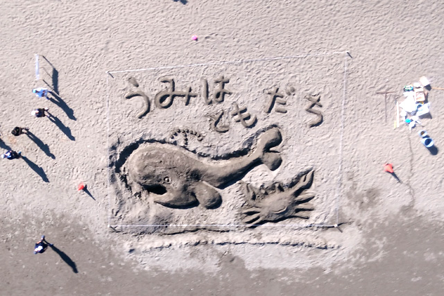 家族連れや子供たちが参加し、くじらとかに(8m×10m)「うみはともだち」のメッセージ付きで砂アートを制作し、上空からドローンで撮影した写真をFBで公開しました。