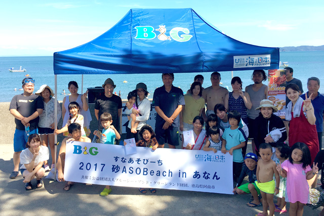 B&G財団は、8月13日(日)午前10時から午後4時まで、徳島県阿南市の北の脇海水浴場で、小学生や一般市民を対象に楽しく海に親しみ、海の日と海の安全への理解を深める機会を提供することを目的に、「砂ASOBeach in あなん」を開催しました。同会場で同時に開催された、あなんマリンフェスティバルには地域住民や夏休みの帰省者など約1400人が来場し、その相乗効果もあり、7月に初めて実施した「砂ASOBeach in ひろの」を上回る約230人が晴れ渡る夏空の下、参加しました。
