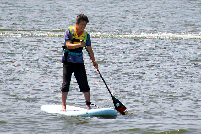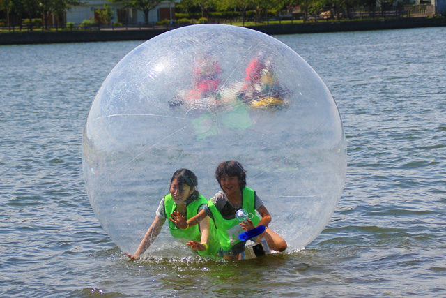 当日は、日本最大の池である「湖山池」をフィールドに、カヌーやバナナボート、ボードに立ってパドルを漕いで進むスタンドアップパドルボード(SUP)、遊覧船、直径2メートルの透明な球体に入って水上散歩ができるアクアボールの5種類の水上体験をしました。
