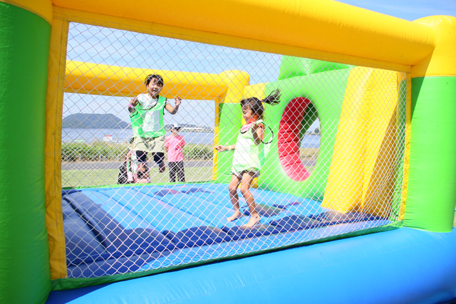 今回、マリンスポーツ体験のほかに、水上に出られない小さな子供でも楽しめるエアー遊具をはじめ、立っている人にフープを通してシャボンの膜で囲う巨大シャボン玉や、バドミントン・フリスビーなどの陸上アクティビティも設置し、多くの子供たちでにぎわいました。巨大シャボン玉を体験した参加者(小学1年女子)は、「シャボン玉の中はぴかぴかしていて面白かった」と話していました。