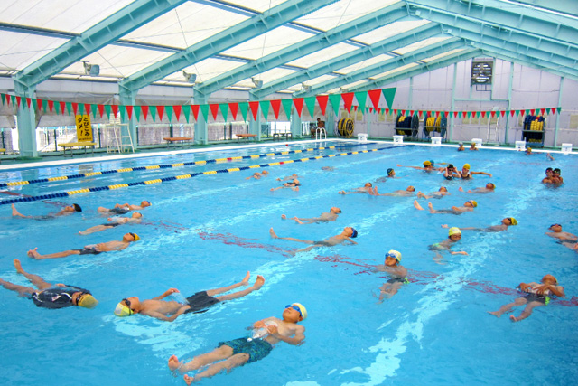 ギネス世界記録に認定された「1分間ペットボトル浮き」は、水に親しみながら身の安全について考えてもらおうと一昨年から始めたものです。今年は7月23日に行われました。ペットボトルを抱えて、同日・同時刻に目、口、鼻と両足つま先を水面上に1分間浮かせていられる人数の世界記録に挑戦しました。