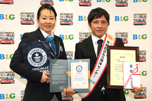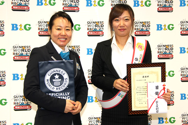 ギネスワールドレコーズ公式認定員の古屋洋子氏(左)から認定証を受け取るB&G財団の菅原悟志理事長