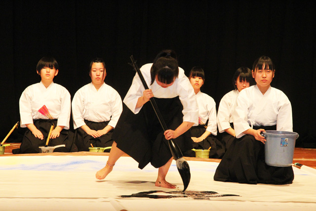 舞台一杯に広げられた紙に描かれていたのは、津波で残った高田松原の奇跡の一本松。静かな調べの中、気合いとともに大書したのが「故郷」の文字、続いて生徒達が一斉に「潮風薫る」から始まり「架け橋となれ」で終わる長い詩文を手分けしてしたためました。会場に向けて書が高く掲げられると、書に込められた未来への決意に圧倒され、参加者から大きな拍手が沸き起こりました。