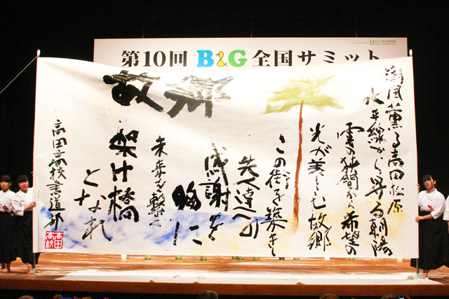 またサミットの冒頭では、岩手県陸前高田市の県立高田高等学校書道部17人による躍動感のあるオープニングパフォーマンスが行われました。紹介にあたった陸前高田市の戸羽太市長は「(陸前高田市は震災を機に)文字通り壊滅しましたが、若者たちの力を借りて今後邁進していきたい。『故郷と未来』をテーマに渾身のパフォーマンスをします」と述べました。全壊した陸前高田市のB&G海洋センターは再建に向け工事中で、今年4月には竣工すると謝意を表明しました。