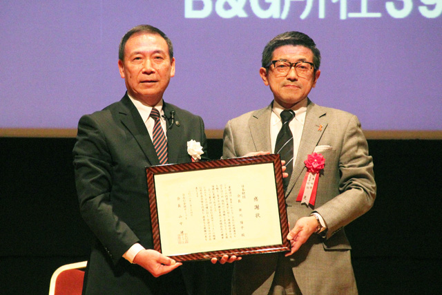 さらに山中会長から「海洋センターの活動を、ボートレース収益金で支援している日本財団に対し、第10回サミットを記念して、390自治体の総意で感謝状を贈呈したい」と提案をいただきました。本件も満場の賛同を受け、壇上で日本財団の前田晃専務理事に全国サミットの山中会長から感謝状が手渡されました。これを受け前田専務理事は「施設をいつまでも大切にされ、地域を担うすべての人のコミュニティの活性化を願っています。日本財団もB&G財団に応えられるようにしていきたい」と述べました。