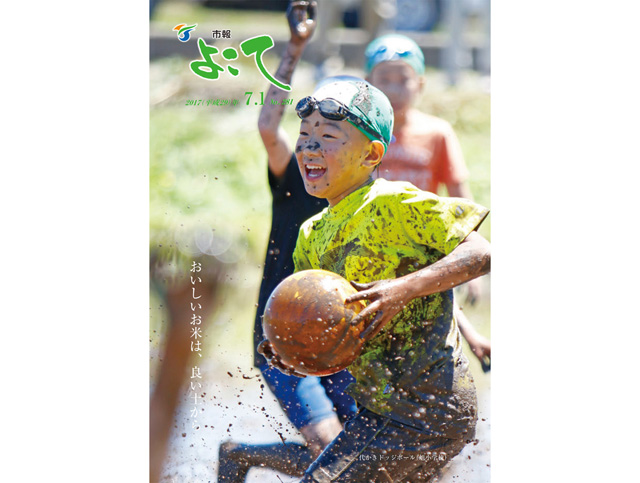 表紙の写真は、市内の田植え前の田んぼで開催された「福本一区春のどろんこ体育大会」。地域を盛り上げたいとの思いから、区民が初めて企画したイベントです。大会には区民や近隣の子ども会などから約120人が参加。全身どろんこになりながら親子そり引きや綱引きを楽しんでいました。