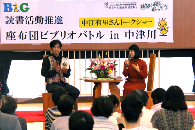 会場である中津川市付知B&G海洋センターは、2015年度に海洋センター内にミニ図書館を設置しており、中津川市内から約120名の観覧者が集まり、中江有里さんによるトークショーや絵本の読み聞かせ、子供たちが自分の自由な発想と表現方法で、オススメ本を紹介する「座布団ビブリオバトル」やブックツリー作成などを楽しみました。