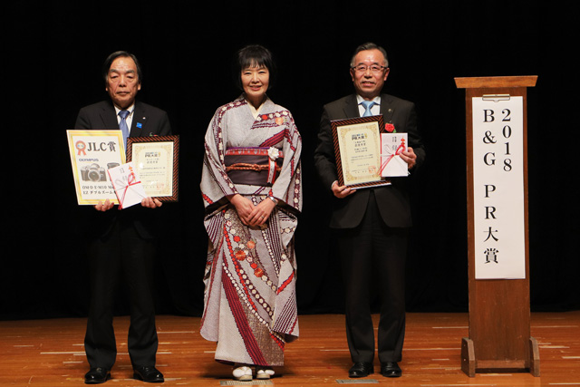 壇上には女優で画家であり、B&G財団の評議員で、PR大賞審査委員長も務める岸ユキさんから、ポスターの部 最優秀賞「香川県 小豆島町内海B&G海洋センター」、広報誌の部 最優秀賞「『広報くじ9月号』岩手県久慈市」を表彰していただきました。